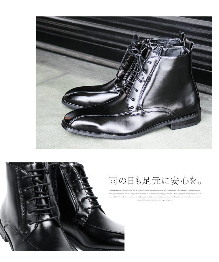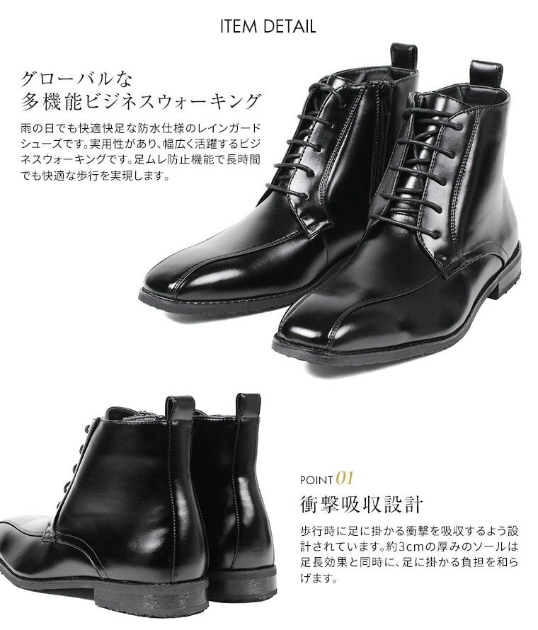 [素材]:アッパー/合成皮革、アウトソール/合成底 [サイズ]:24.5cm/25cm/25.5cm/26cm/26.5cm/27cm [ソール高さ]:約3cm [足囲]:3E(EEE)相当 [筒丈]:約13.5cm [履き口周り]:ヒモで調整出来ます。