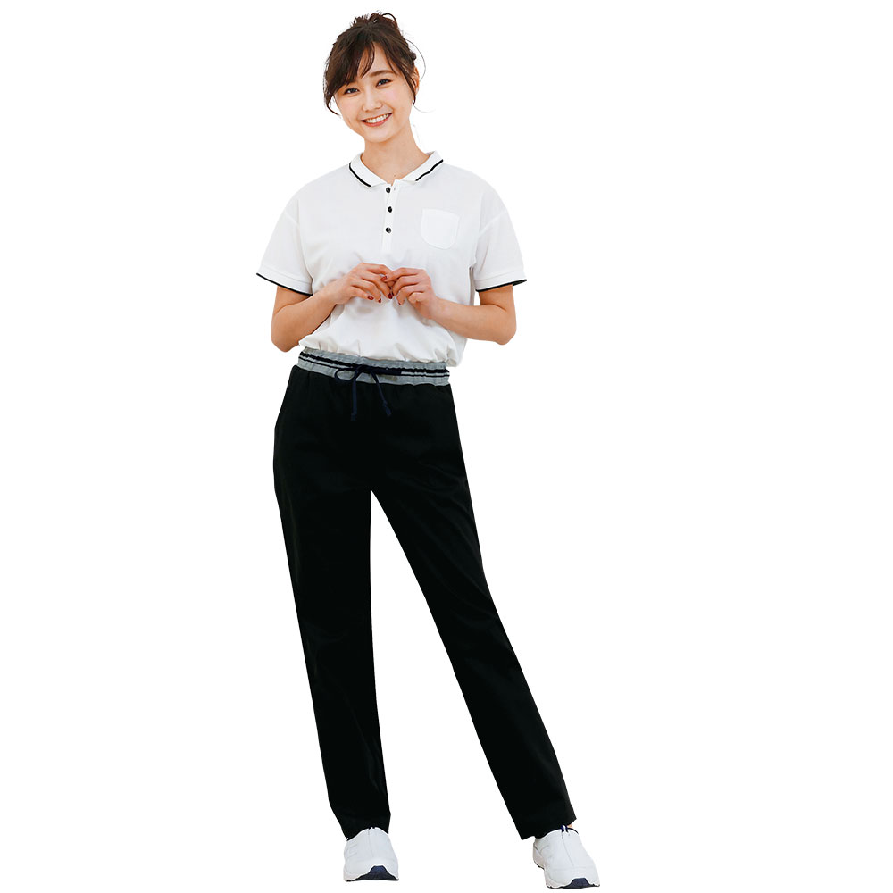 ●素材/綿97%ポリウレタン3%●ポケット位置/前両脇、両ヒップ●ウエスト調整紐付●サイズ(cm/約)【着用イメージ】【ポイント】タックインもできる配色リブ楽のびウエストゴム仕様便利なヒップポケット【カラー】